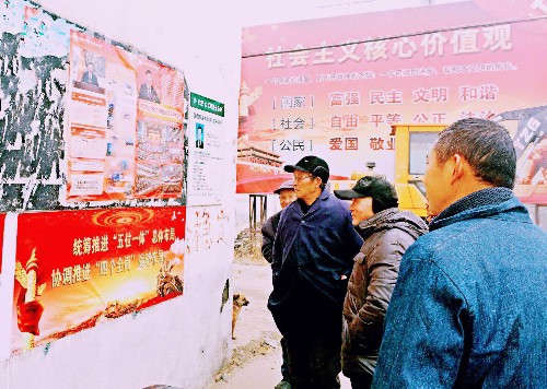 为深入宣传党的十九大精神,近日,小官庄镇杨蒋村在村主干道路口张贴十九大精神宣传画报。画报刚刚张贴上墙,就陆陆续续有路过的村民停下脚步,自觉诵读起来,边看边讨论。