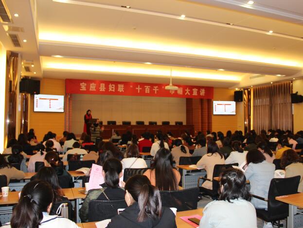 为更好地发挥典型的示范带动作用,引领广大妇女学习贯彻党的十九大精神,建功新时代,4月10日上午,宝应县妇联举办“十百千”巾帼大宣讲活动。扬州国凤刺绣厂技术总监莫元花做全国“两会”精神宣讲,宝应县国税局一分局二股副股长张燕、宝应县图书馆徐丽分别做县三八红旗手(集体)事迹宣讲。县妇联主席高学娟、副主席孙娅、县妇儿工委办主任张丽玲、县党史办副主任杨素娟、县妇联兼职副主席薛梅、万绘等出席活动,全县各机关单位妇联共150名女性代表参加本次活动。