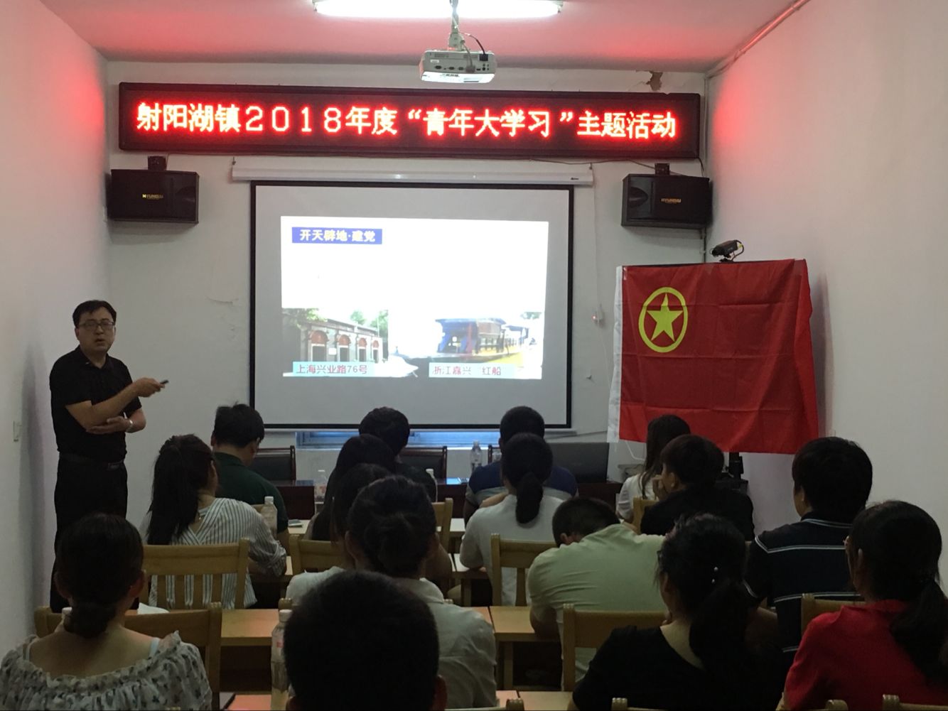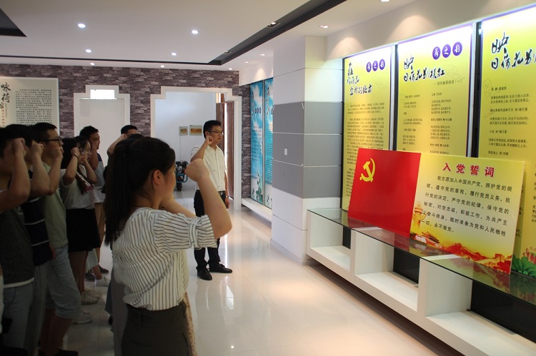 党课结束后,大家集体观看视频《旗帜:七年知青岁月》,随后,一齐参观了扬州市廉政教育基地——咏荷馆,并开展了一次重温入党誓词活动。在鲜红的党旗下,全体青年干部举起右手、握紧拳头,庄严宣誓。