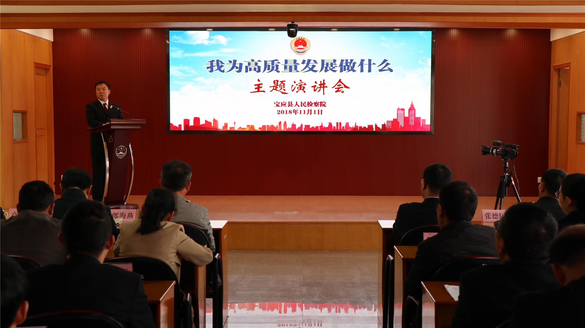 “一进三学”活动结束后,院政治处、党总支联合举办了“我为高质量发展做什么”主题演讲会,程亚男、潘昊、刘丽、索兴阳等4名党员和干警先后作了激情似火的演讲。院党组成员、政治处主任邱甜对活动进行了点评,认为演讲的内容主题鲜明、演讲者表达连贯得体、活动带来的启迪效果明显,4名干警从深层次分析了高质量发展的内涵、检察机关的使命、自身的担当,展现了新时代检察干警的精神风貌。院党总支副书记侯维白主持演讲会。