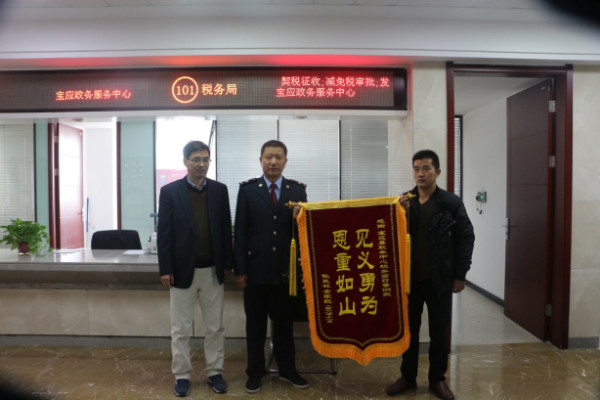 11月2日,一对中年夫妇手持一面“见义勇为 恩重如山”锦旗来到宝应县政务中心地税窗口,一把握住鲁洲东同志的手,眼中泛着泪花,几欲跪下,旁边的群众搀扶住他们后,又连连鞠躬致谢,感恩之情溢于言表。