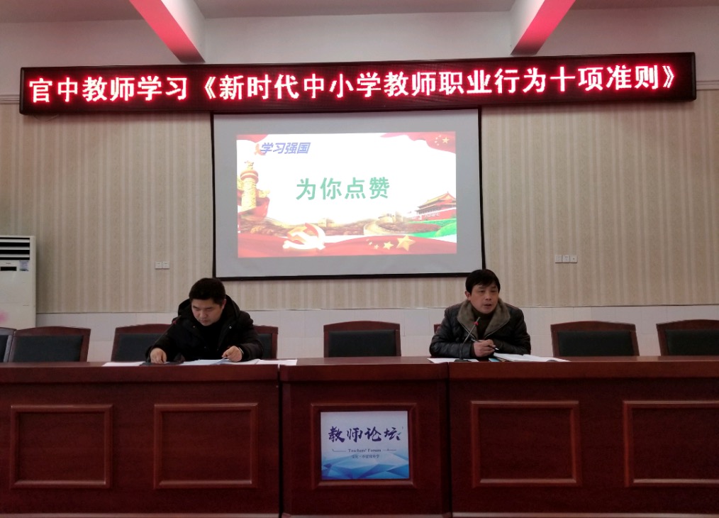 为深入贯彻习近平新时代中国特色社会主义思想和党的十九大精神,贯彻落实全国教育大会精神,进一步加强师德师风建设,小官庄镇中心初中党支部组织全体教职工开展了《中小学教师职业道德规范》《新时代中小学教师职业行为十项准则》的学习活动。