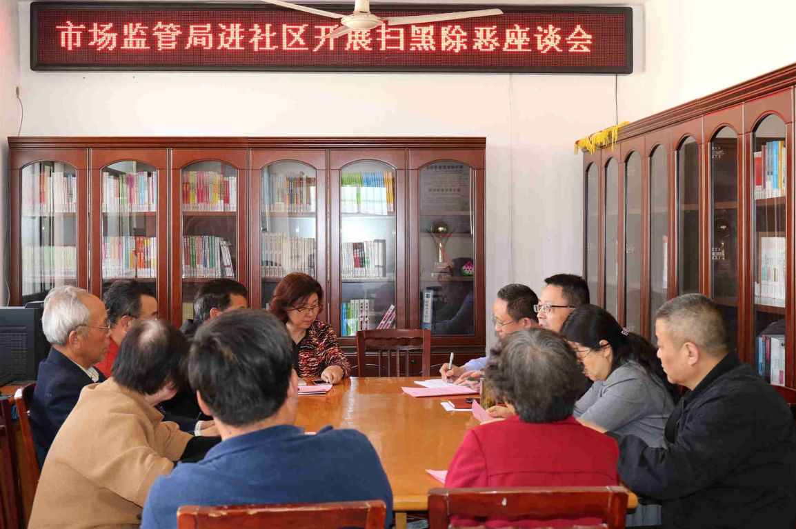局党委主要负责同志和党委成员进社区、进市场开展走访排查活动,与结对社区干部进行座谈交流,了解社区扫黑除恶专项斗争开展情况,掌握第一手资料。进市场了解市场运营情况及扫黑除恶工作现状,与市场管理人员座谈,听取扫黑除恶专项斗争日常工作情况汇报,了解市场扫黑除恶宣传发动、线索摸查、发动群众等工作进展、重点难点及下一步工作计划;与市场经营户开展座谈,了解市场经营环境是否满意,是否有涉黑涉恶乱象,鼓励大家积极举报、提供线索,同时积极回应了经营户对扫黑除恶工作的疑问和顾虑;在市场管理人员陪同下走访经营户,分发集贸市场扫黑除恶宣传材料,了解不同行业扫黑除恶新动向。