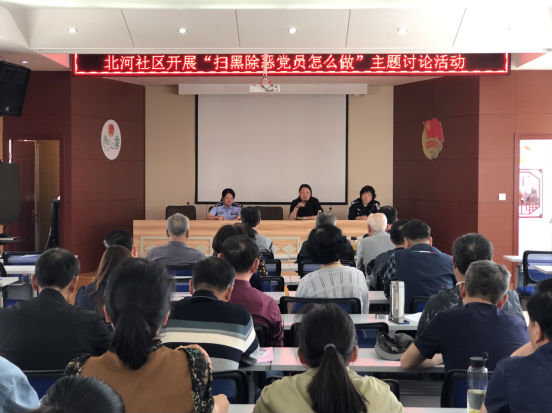 三是组织扫黑除恶主题讨论。北河社区党总支邀请党代表、公安民警进社区,与社区党员围绕扫黑除恶专项斗争中党员“应该做什么、应该怎么做”进行讨论,并交流心得体会,引导党员群众积极参与扫黑除恶专项斗争行动。