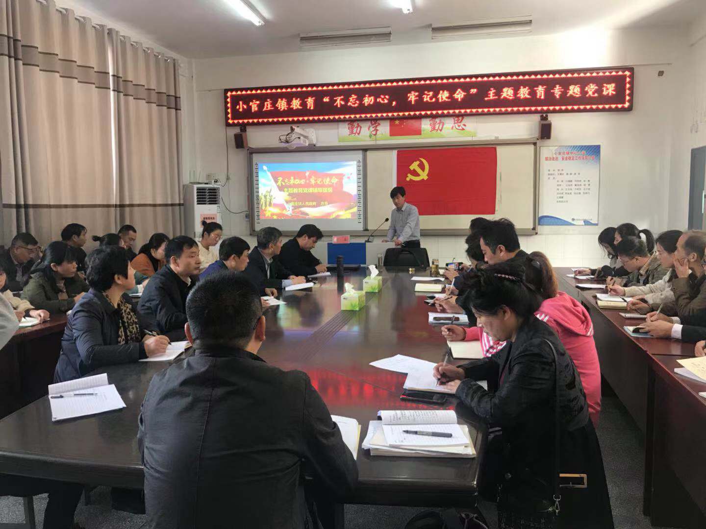为进一步推进“不忘初心、牢记使命”主题教育走向深入,做到学思用贯通,知信行统一,10月30日下午,小官庄镇分管教育副镇长方春在镇中心小学会议室为教育支部全体党员送了一堂“不忘初心、牢记使命”主题教育专题党课。大会由教育总支部书记、中心初中校长苗培鹤主持。