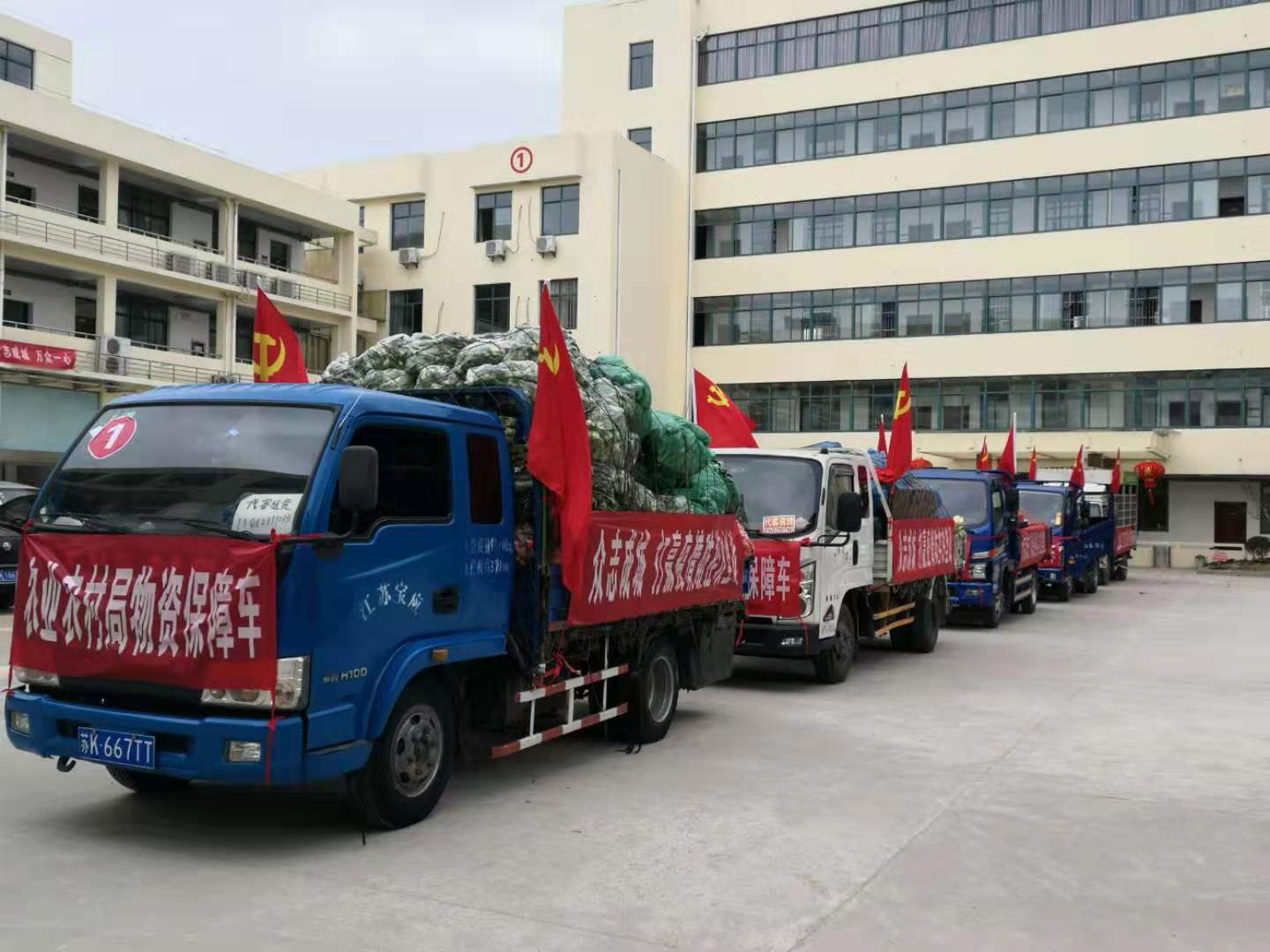 一片片新鲜的猪肉挂满了“放心肉”专用运输车,活水运输车中鲫、草等家鱼在跳跃,刚采摘的萝卜、莴苣、核桃乌青菜透着说不出的新鲜,鸡蛋、大米、面粉、菜油等各类生活物资应有尽有,整齐地码放在挂着红色条幅的援助车上,整装待发。
