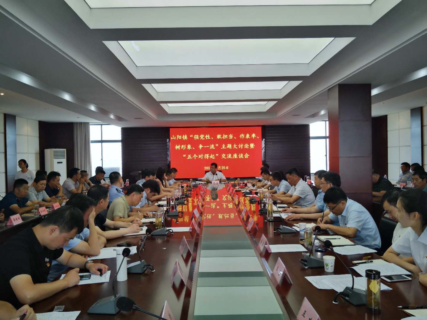 7月25日,山阳镇召开“强党性、敢担当、作表率、树形象、争一流”主题大讨论暨“五个对得起”交流座谈会,镇助理级以上干部、各村(居、养殖总公司)支部书记、单位负责人参加会议。