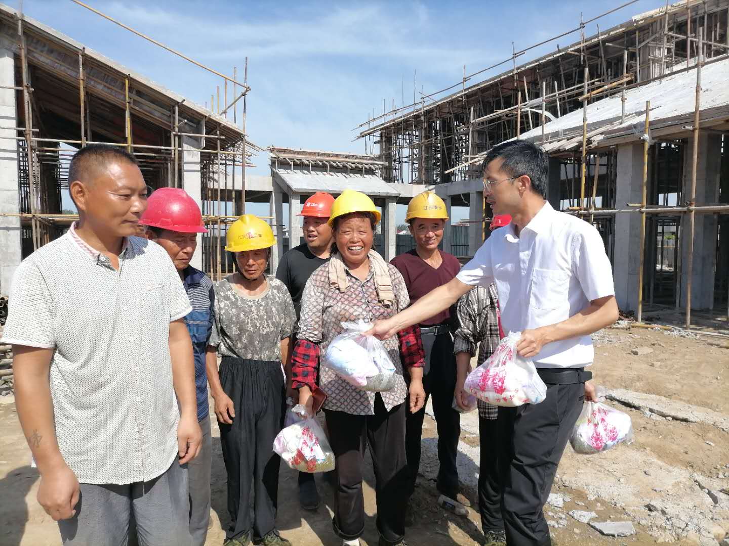 慰问团一行先后到金庄村、徐杨村、中南村、颂阳村、顺河村等村级党群服务中心施工现场,为大家送上毛巾、香皂、绿豆等慰问品。