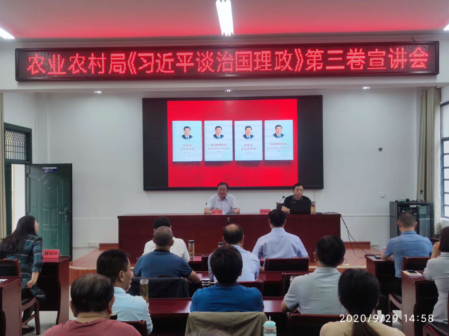 9月29号下午,县农业农村局举办《习近平谈治国理政》第三卷宣讲会暨“激情·实干·逐梦”演讲比赛决赛。活动由局党委副书记、农推中心主任杨明主持,进行宣讲,局领导班子成员、中层干部以及入党积极分子等参加活动。