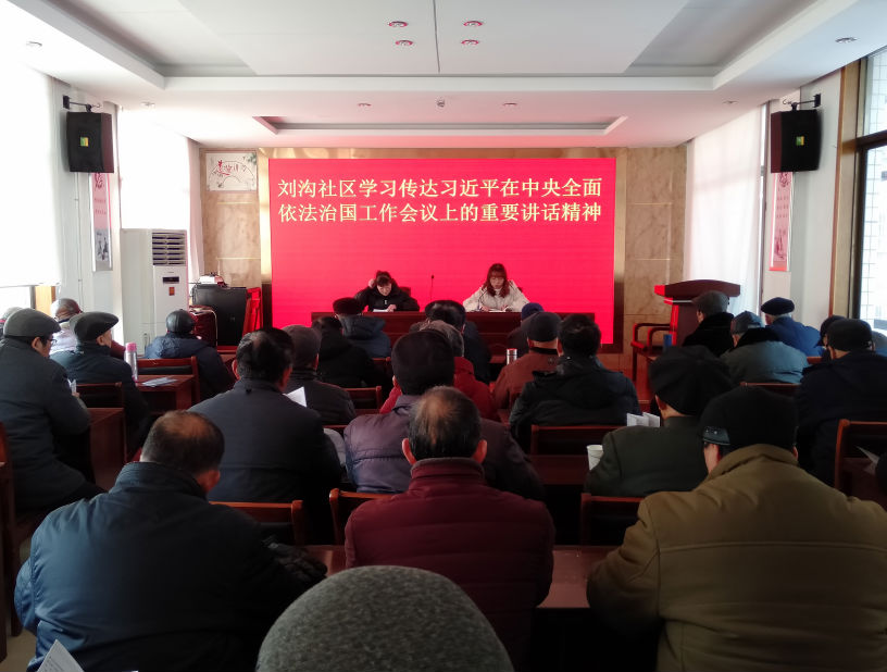 刘沟社区党委组织党员学习习近平在中央全面依法治国工作会议上的重要讲话精神,准确把握十一个坚持的重大工作部署和重大战略思想,深刻领会全面依法治国政治方向、重要地位、工作布局、重点任务、重大关系、重要保障。