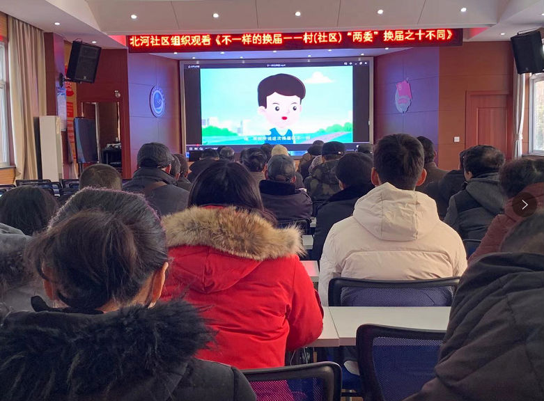 北河社区党委组织党员集中观看视频《不一样的换届——村(社区)“两委”换届之十不同》,统计办党支部组织党员观看《为了总书记的嘱托》系列视频。