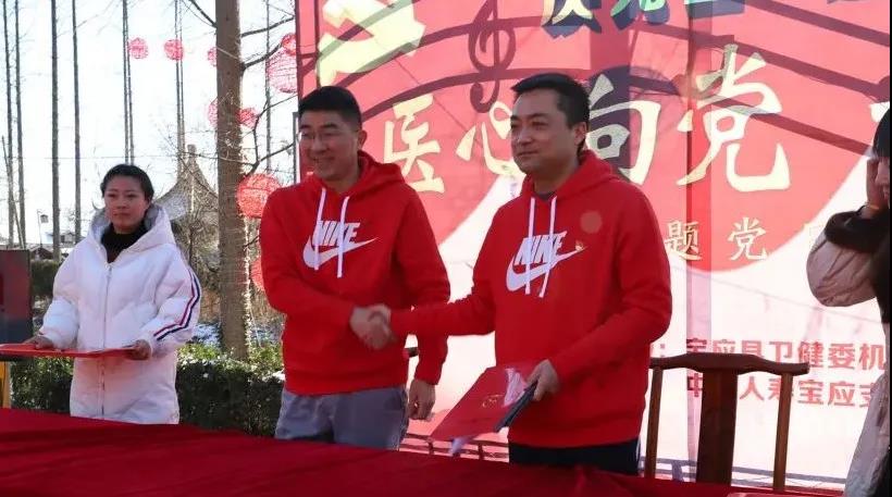 卫健委副主任张正军与中国人寿宝应支公司总经理周兵签订党建共建协议。卫健委副主任蔡美斌领誓,全体人员重温入党誓词。