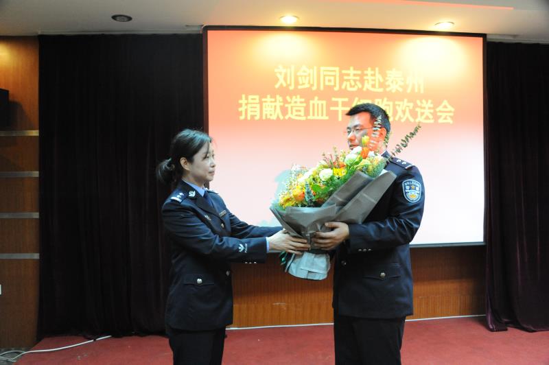 欢送会上,刘剑同志分享了捐献感言;法警大队副大队长满彦娥向刘剑同志赠送鲜花;全体参会人员合影留念。