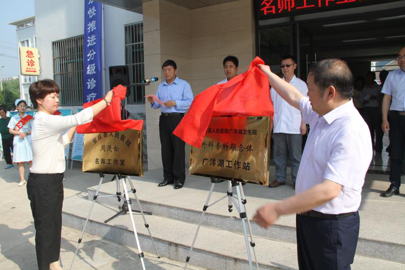 揭牌仪式由副镇长冯华主持,镇党委书记姚绍瑜女士致辞,县卫计委副主任蔡美斌、县人民医院院长刘立新、副院长周茂松分别作了讲话。仪式上,刘立新、周茂松两名师工作室分别与广洋湖镇卫生院进行签约,随后,与镇党委书记姚绍瑜一道为内、外科工作室揭牌。通过设立县人医广洋湖卫生院内科、外科专科联合体(广洋湖站),刘立新、周茂松名师工作室将更好地发挥名师示范带动作用,帮助基层医院培育特色科室,开展新技术、新项目,帮带培养特色科室团队和人才梯队,让医疗技术下沉,使群众不出镇能享受县级名医的医疗服务。