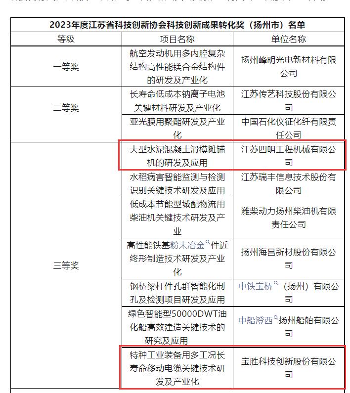 近日,江苏省科技创新协会发布2023年度江苏省科技创新协会科技创新奖评奖结果,共评选出100项科技创新奖,扬州市共13个项目入选(成果转化奖10项,发明奖3项),宝应科协指导推荐的两家企业科协申报项目获得2023年度江苏省科技创新协会科技创新成果转化奖三等奖,分别是宝胜科技创新股份有限公司特种工业装备用多工况长寿命移动电缆关键技术研发及产业化项目、江苏四明工程机械有限公司大型水泥混凝土滑模摊铺机的研发及应用项目。