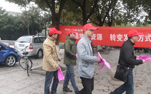 4月20日是全县党员统一活动日。一大早,广电总台党员志愿者们来到结对的北河社区,在北河公园开展4·22世界地球日主题宣传活动。志愿者们向周围群众发放了雾霾预防常识、建设绿色生态文明宣传手册等材料,现场解答群众提出的各种环保问题,倡导人人参与环境保护、树立生态文明的理念。