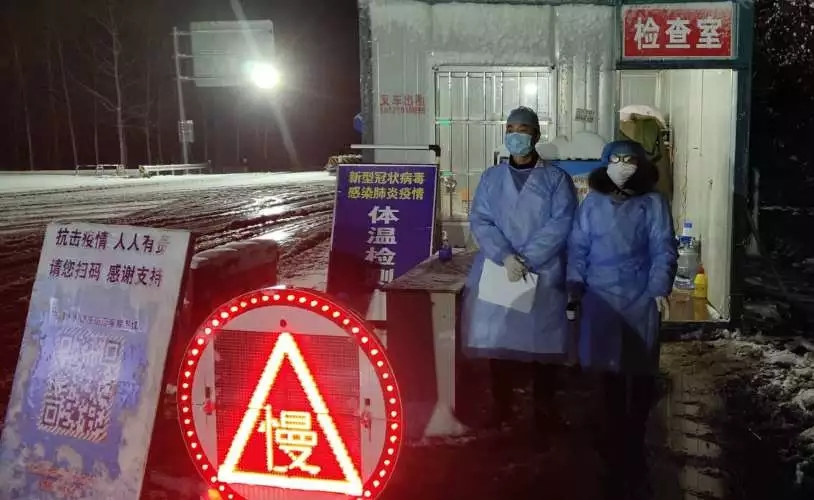 卫健系统党员医护人员在国道卡口处为过往车辆驾乘人员查测体温
