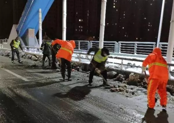 城管系统党员干部带领环卫工人在城区主要桥梁、道口、主干道进行除雪作业