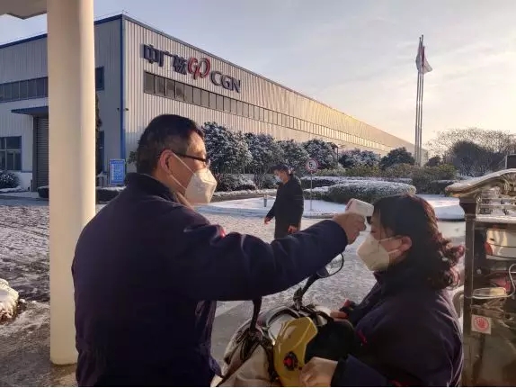 中广核新奇特公司党员志愿者为工人测量体温,积极服务企业复工
