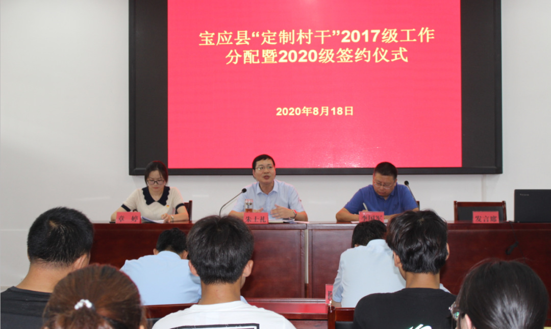 会上,宣读了《宝应县2017级“定制村干”工作分配方案》。接收“定制村干”的镇、村党组织负责人代表作了交流发言,2名2017级“定制村干”代表围绕转变角色、融入乡村进行表态发言。新录取的2020级“定制村干“及家长签订了培养就业协议。