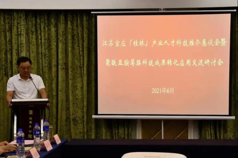 为加快我县聚酰亚胺薄膜产业转型升级,近日,江苏宝应产业人才科技推介恳谈会暨聚酰亚胺薄膜科技成果转化应用交流研讨会在广西桂林举办。副县长丁子建,县委组织部、县科技局、县工信局、县生态环境局、柳堡镇有关负责同志和桂林电器科学研究院、中国电器工业协会绝缘材料分会相关领导、专家教授参加活动。