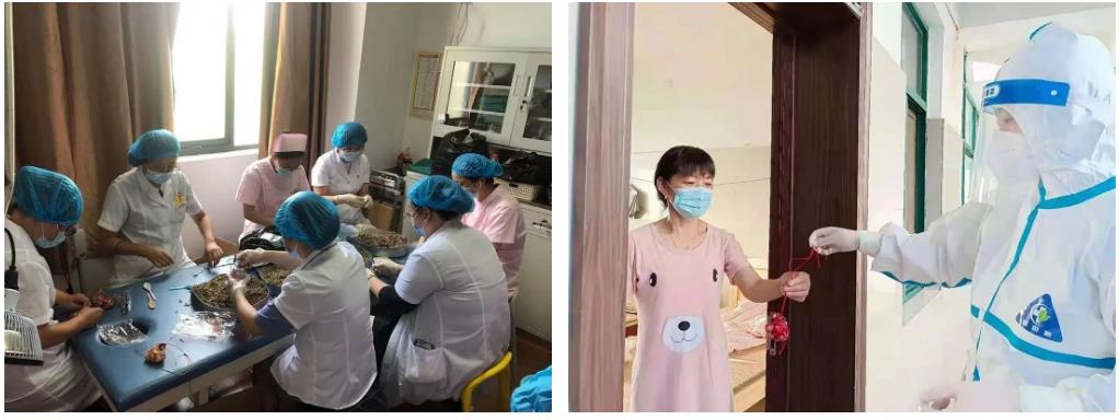 县级名医李霞带领中医人员加班加点制作防疫香囊,充分发挥中医药的特色与优势,为所有隔离点人员送去香囊、送去平安。