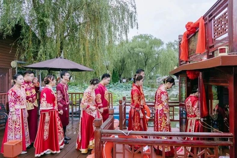 着中式传统礼服 ,迈火盆、跨马鞍、却扇礼、饮合卺酒…… 一道鹊桥横渺渺,千声玉佩过玲玲,在七夕佳节,2023宝应县青年人才集体婚礼暨“藕遇美好”赏荷活动在射阳湖镇荷园甜蜜礼成。