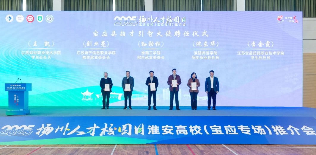 陈五湖为淮阴工学院、淮阴师范学院、江苏电子信息职业学院、江苏食品药品职业技术学院、江苏财经职业技术学院等5所高校招生就业主要负责同志颁发招才引智大使聘书。