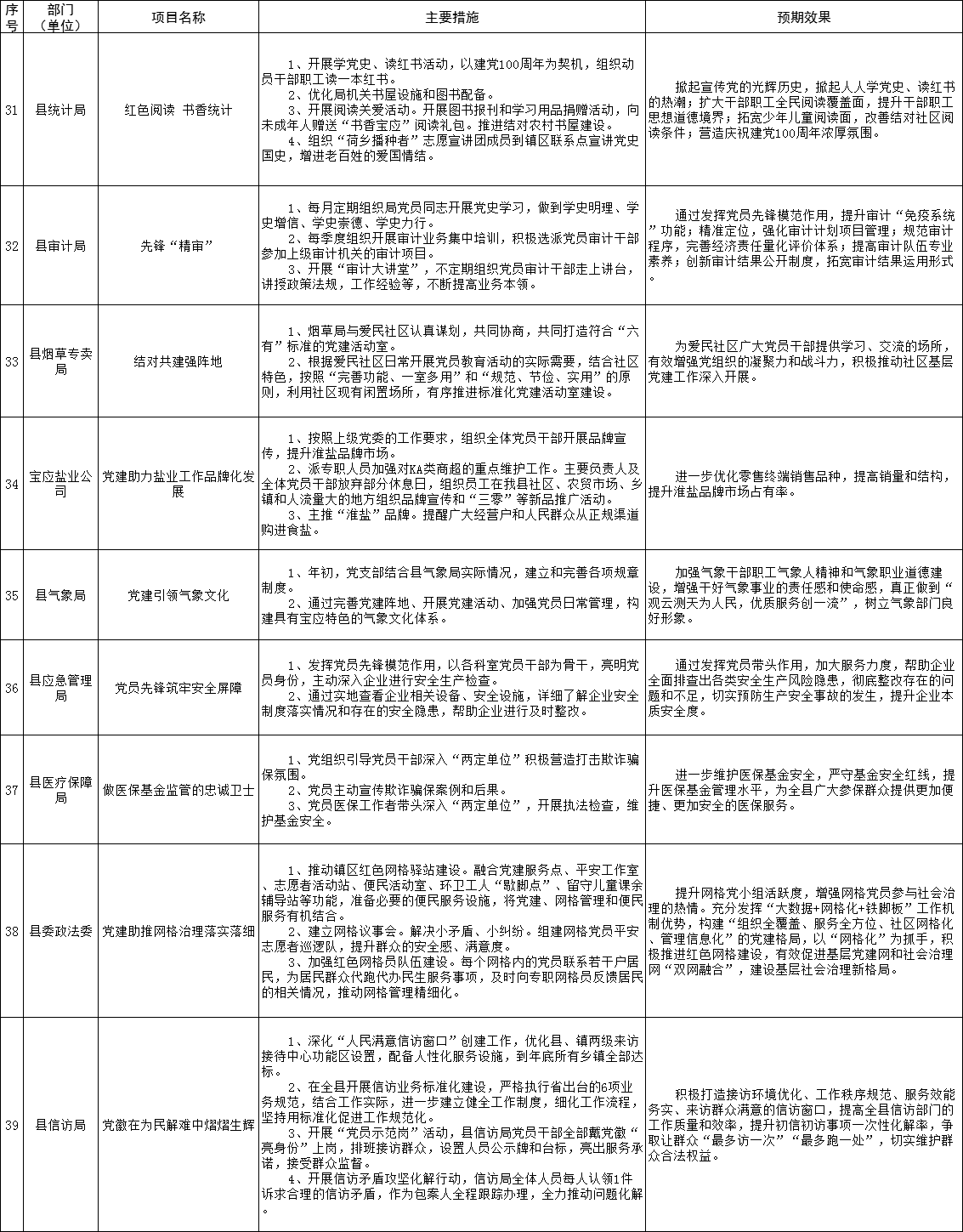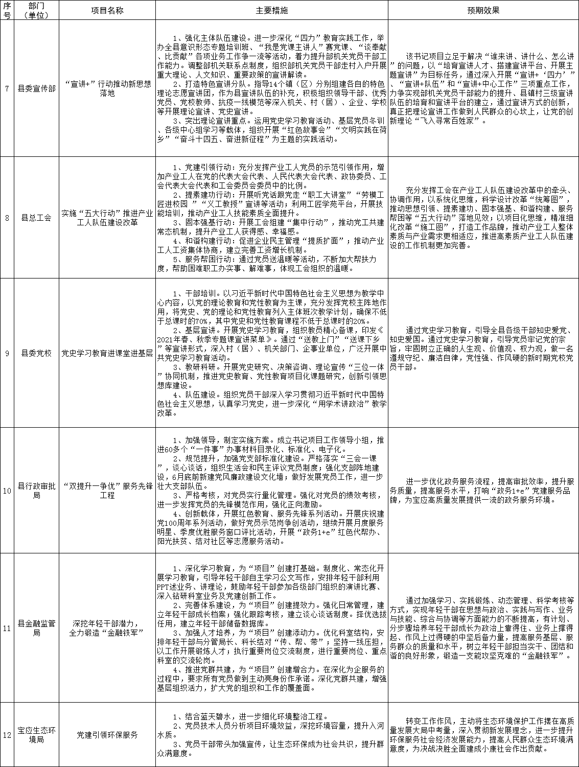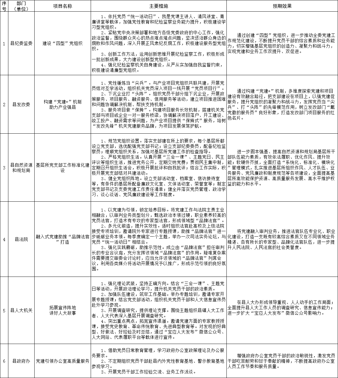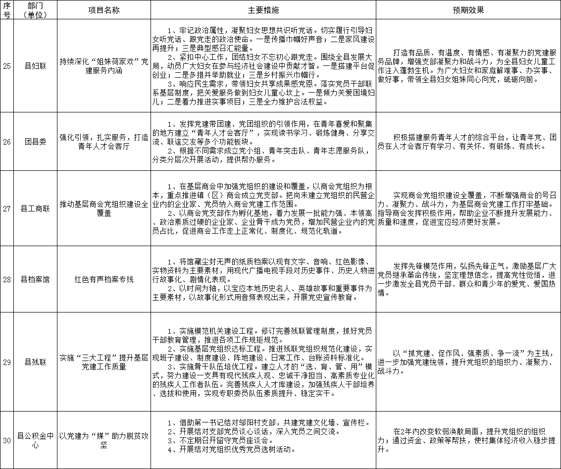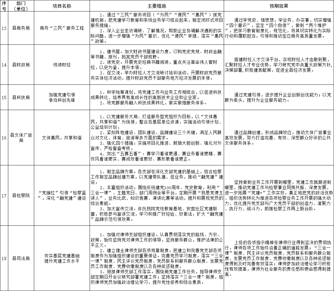 为强化党委(党组)抓基层党建工作责任,建立“书记带头抓、亲自抓”的工作责任制,全县各在城部门围绕2021年度基层党建重点任务,聚焦突出问题,明确了“双强双提升”等一批基层党建“书记项目”。现予以公示,接受广大党员群众监督评议。